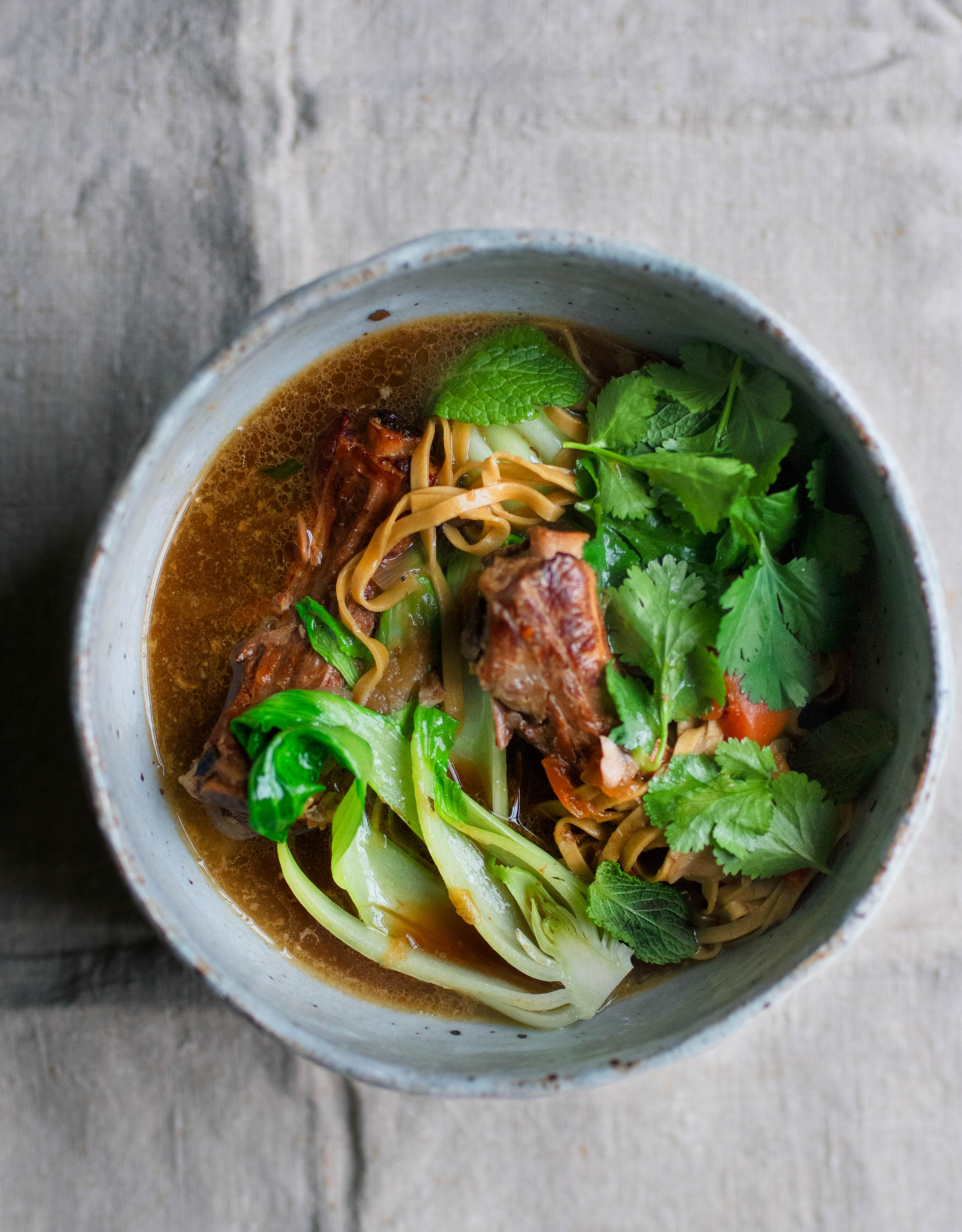 For the soup, steam the pak choi for 2 minutes in a small steamer basket over a pan of boiling water. Bring the stock to the boil. Put the cooked noodles into three deep bowls, tuck in the cooked pak choi and the reserved rib bones, then ladle in the steaming broth. You can season with a few drops of sesame or chilli oil as you wish, and scatter in a few leaves of coriander and mint.