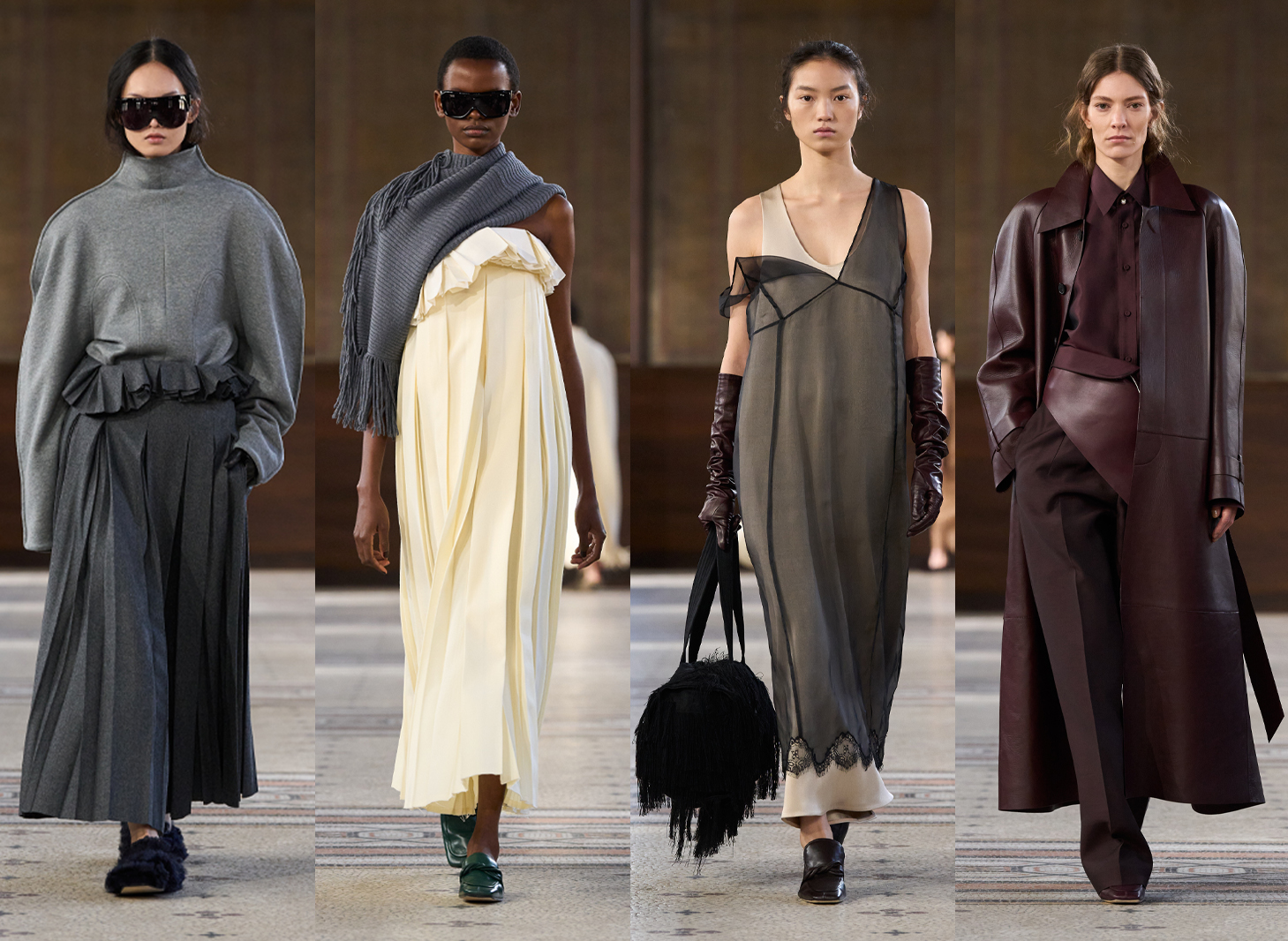 Mark Thomas’s sophomore show portrayed a self-assured woman, her wardrobe disciplined yet designed for confidence with a softness beneath the structure. Tailoring had a uniformity, cut with precision, utilitarian-inspired coats with defined shoulders were cinched with thin leather belts to create a disciplined silhouette. Thomas's softer looks came via referencing French interiors; the designs gave way to draping on dresses, fringing, tapis, and blankets that created a relaxed, lived-in elegance. Satin slips layered under sheer mesh ones, some slipping from a shoulder, and textured knits came with fluffy fringing, so did coats, alongside dresses and tops with rounded shoulders. Lighter still were the panelled dresses and blouses appearing with abstract petal shapes, deconstructing volumes and folds. The palette of muted tones ranged from wine and chocolate to pale grey, black and ecru. Fringed gloves swished from cuffs, while a closing dress and skirt, in paper-thin mille-feuille-like fabric, swayed gently with every step.