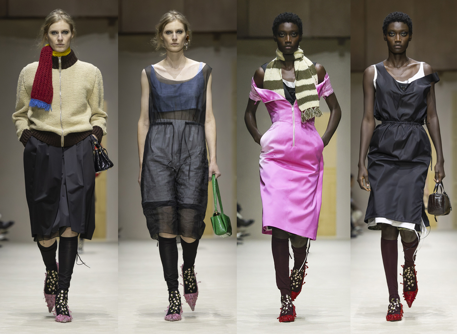 Co-creative directors Miuccia Prada and Raf Simons cast just 15 models, each wearing four layered looks, for a total of 60 exits, revealing a new layer on each catwalk lap like a matryoshka doll. Model Julia Nobis, opened the show in a long black coat with a striped hand-knit scarf casually draped around her neck. The next time she appeared the coat was gone and we saw her emerge in a chunky zip sweater, on her third exit the penny dropped with the confused audience; sweater-less with skirt in fact a black zip front dress, and on her fourth circuit the last layer revealed a diaphanous shift and modest bloomers. This was a show of wardrobe changes, Simons explained after the show, it was about how we relate to our clothes and how we put them together in ingenious ways. “It’s a lot about the freedom to be inspired and to bring things together that feel contemporary to us,” he said. Highlights included floral embroidered socks, a blue button-down shirt worn with a scarlet beaded slip and a black shift dress spliced to reveal a floral print from the archives.