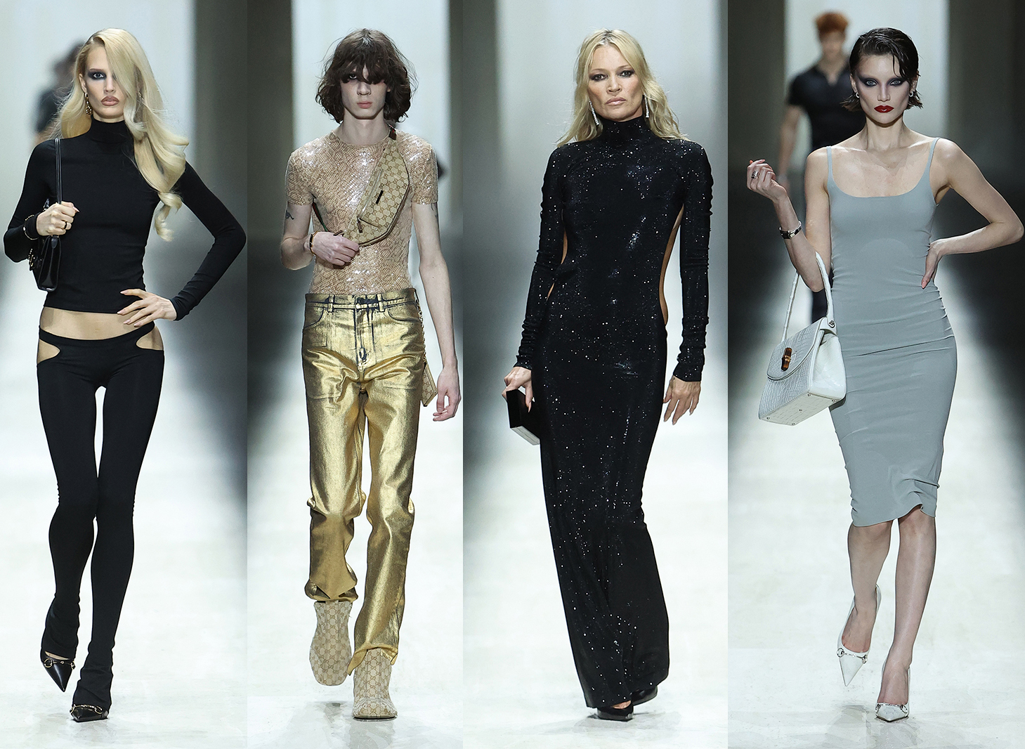 Demna’s much anticipated debut runway show at Gucci delivered a 90s-inspired collection with references to iconic moments from Tom Ford's tenure at Gucci. Last season the former Balenciaga designer hosted a film premiere to tease his debut La Famiglia collection instead of a traditional show. AW26 saw his first runway show, staged at the grand Palazzo delle Scintille in Milan, where the designer transformed the space into a museum filled with specially-made replicas of ancient sculptures. On the front row, Demi Moore and her chihuahua Pilaf were flanked by Donatella Versace (wearing a red coat with golden GG buttons) and former Gucci designer Alessandro Michele. Opening with gym boys in muscle tees, leather zip-up jackets and bottom hugging jeans, followed by hip swinging glossy-lipped Gucci femme fatales, Demna brought sexy back for a new era. Bodycon pencil skirt suits, mini dresses and skin-tight leggings with cutouts exposing the hips were accessorised with handbags shown off in the crook of their elbows, the men strutted in shrunken suits worn on the hips to expose their GG underwear. The temperature rose mid-show with shrunken bombers edged in shearling and drainpipe leather jeans worn with an oversized coat, finished with horsebit heels. Evening wear for men comprised of stretchy sequin co-ords, for women; slinky sequin gowns. More 90s nostalgia finished the show with Kate Moss giving everyone the meme moment of the week, exposing her GG thong in a bottom cheek-revealing, backless sequin gown.