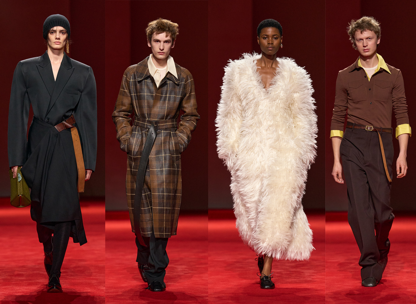 Bottega Veneta creative director Louise Trotter is clearly feeling inspired by Milan. While she was vocal in her excitement and intrigue for the city that she adopted when she took on the top job at the Milan-based brand last year, her sophomore collection was entirely dedicated to the fashion capital and the dialogue it fosters “between brutalism and sensuality”. For this collection, the duality played out with contrasting proportions: at times silhouettes were shrunken and cinched, at others exaggerated and cocooning. The highly skilled and storied craft of intrecciato leather weaving for which the house is well known was explored in new dimensions, popping up on coat lapels and in a subtle tartan pattern, while the flamboyant fibreglass skirts of her first season became full-blown flouncy gowns. It was a mix of norm-core corporate and Teatro Scala Gala that in this city are usually two sides of the same coin.