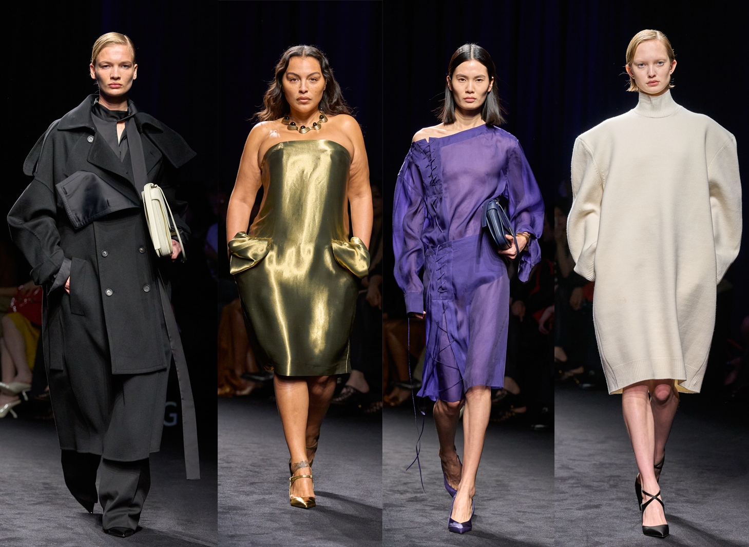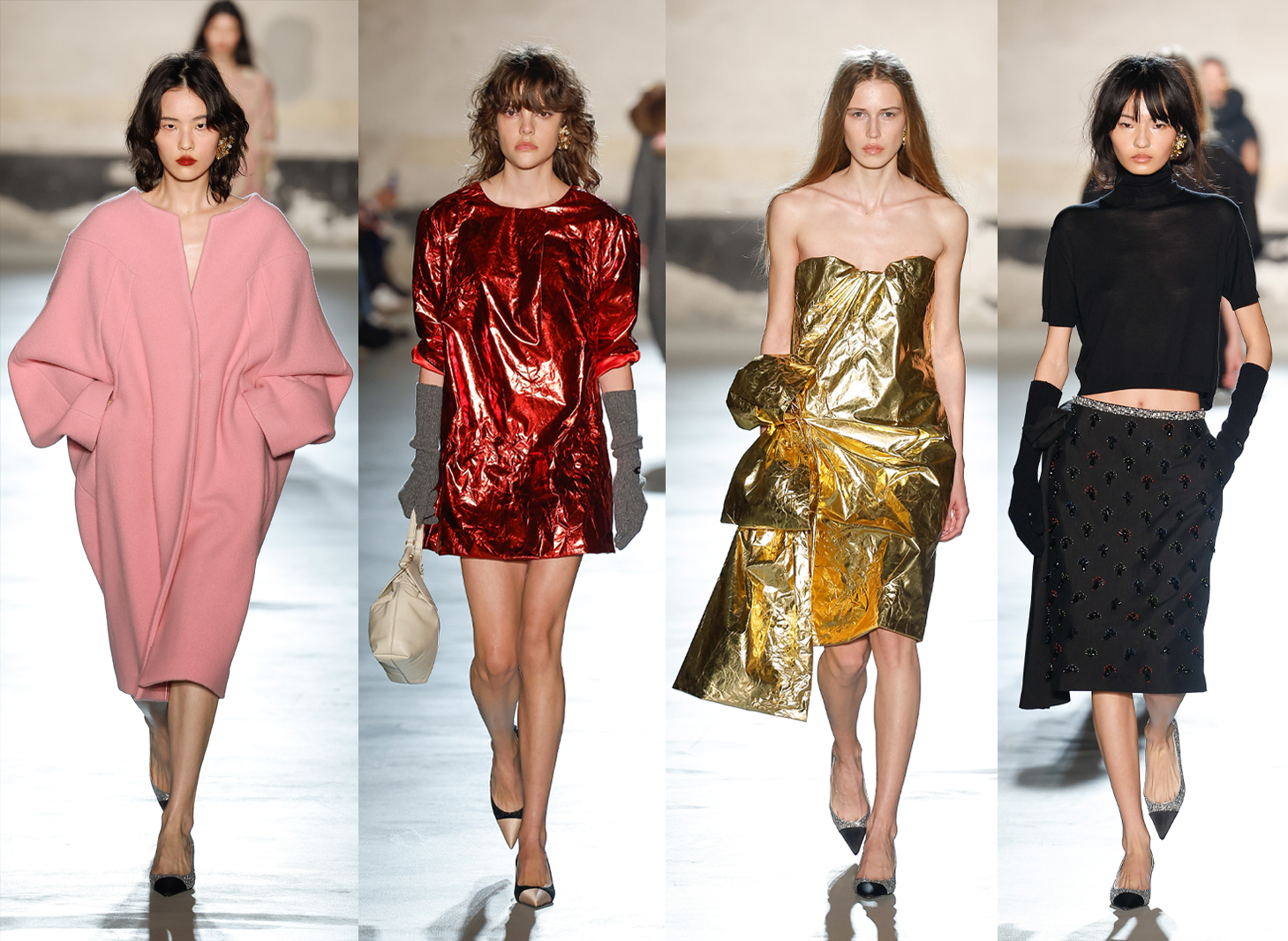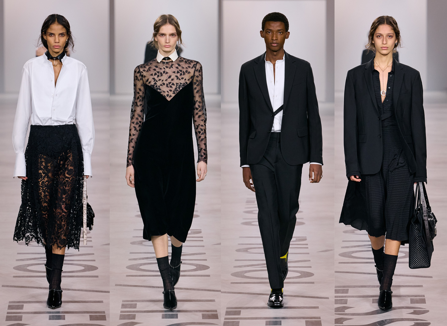 Alessandro Dell'Acqua flipped his AW26 show on its head by starting with the model parade finale, influenced by Federico Fellini's film 8 1⁄2, emphasising that endings can also signify new beginnings. He also drew from Sophie Calle's The Hotel, Room 47, where Calle analysed guests' lives through a voyeuristic lens. Spritzing their perfumes, sampling the contents of their makeup bags, and trying on their clothes became art. With this metaphor in mind, Dell’Acqua created a wardrobe that reflected femininity and the charm of keeping it real. The collection, brimming with highlights of a signature cool girl aesthetic, cast a spell that made you wish you owned every piece. Opening with 15 minimal black looks, they ranged from boyish trousers and a lace slip dress with a full chiffon lining to pencil skirts and strapless polka dot dresses. It culminated in kimono-style coats that cocooned the body, closing with a dazzling black glitter ball gown and a strapless liquid gold gown with an oversized bow tied at the side. Dell’Acqua’s skill is making every piece have real-wardrobe appeal – undeniably chic and attention-grabbing.