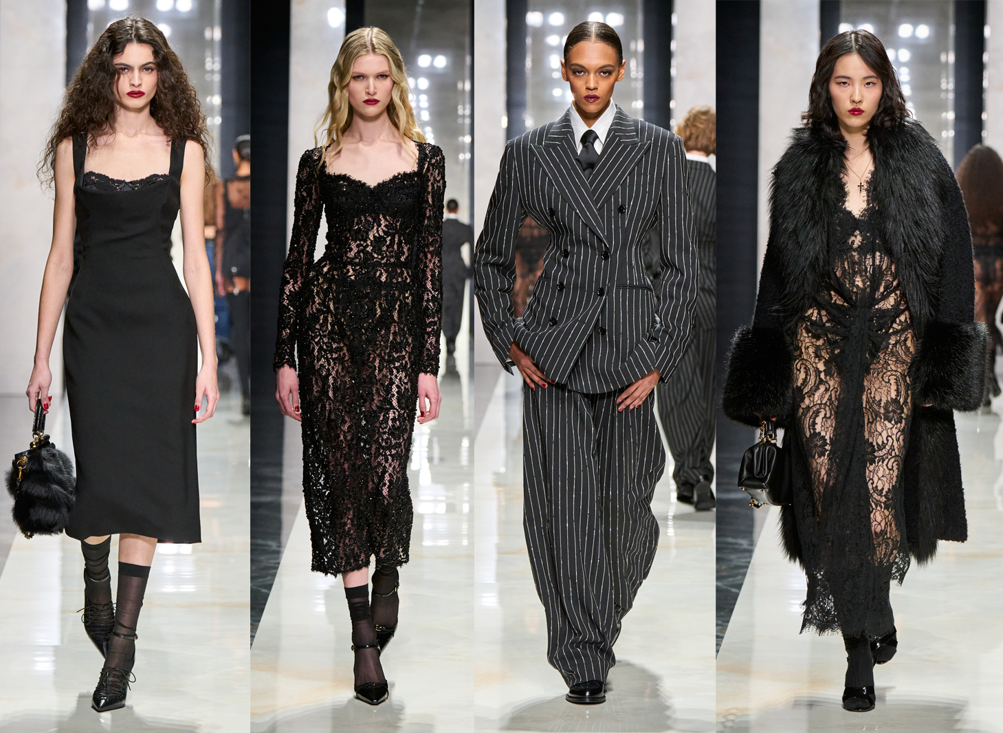 At 67 years old, few people have the star power or invoke the same otherworldly awe quite like Madonna. As it turns out, it’s quite hard to concentrate on the catwalk when the Queen of Pop is sitting front row. Following the frenzy that ensued when the Material Girl took her seat next to Anna Wintour at the invite of designers Domenico Dolce and Stefano Gabbana on Saturday afternoon, a collection that was classic Dolce & Gabbana with a twist played out in front of her. Along with the signature bodices, sheer lace dresses and tuxedo tailoring in this hit-heavy lineup were nods to Madonna’s own iconic wardrobe over the years, such as the pinstripe suits and braces that she wore on tour in 1993 (which were conversely designed by Jean Paul Gaultier). Elsewhere the introduction of crocheted shawls and flat lace-up brogues introduced more cosy-meets-practical accents to a brand that is not particularly known for either. Clearly not wanting to be perceived as a label living in the past, the designers made a point on the contrary in their show notes: “This is not nostalgia. It is presence. A language built on roots that are still alive,” they said.