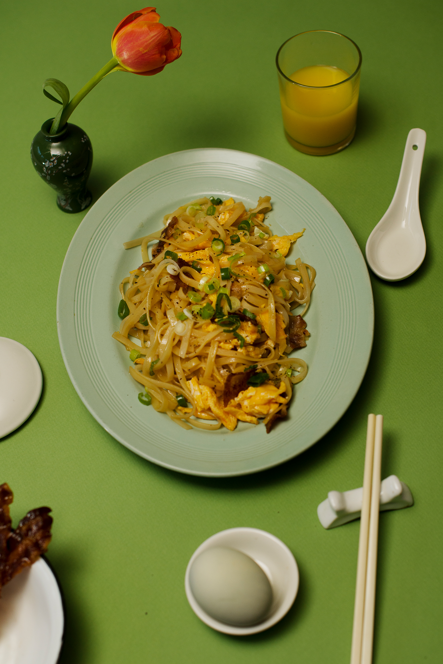 Why not have your bacon and eggs with noodles instead of toast? This recipe is fast and makes a gorgeous breakfast or brunch, perhaps with orange juice and coffee. Rice noodles come in various different forms: mainstream supermarkets sell ready-to-use noodles, while Chinese shops also stock compressed fresh noodles that may require a quick blanching before you cook (check instructions on the packet). Dried rice noodles need to be pre-soaked according to packet instructions.