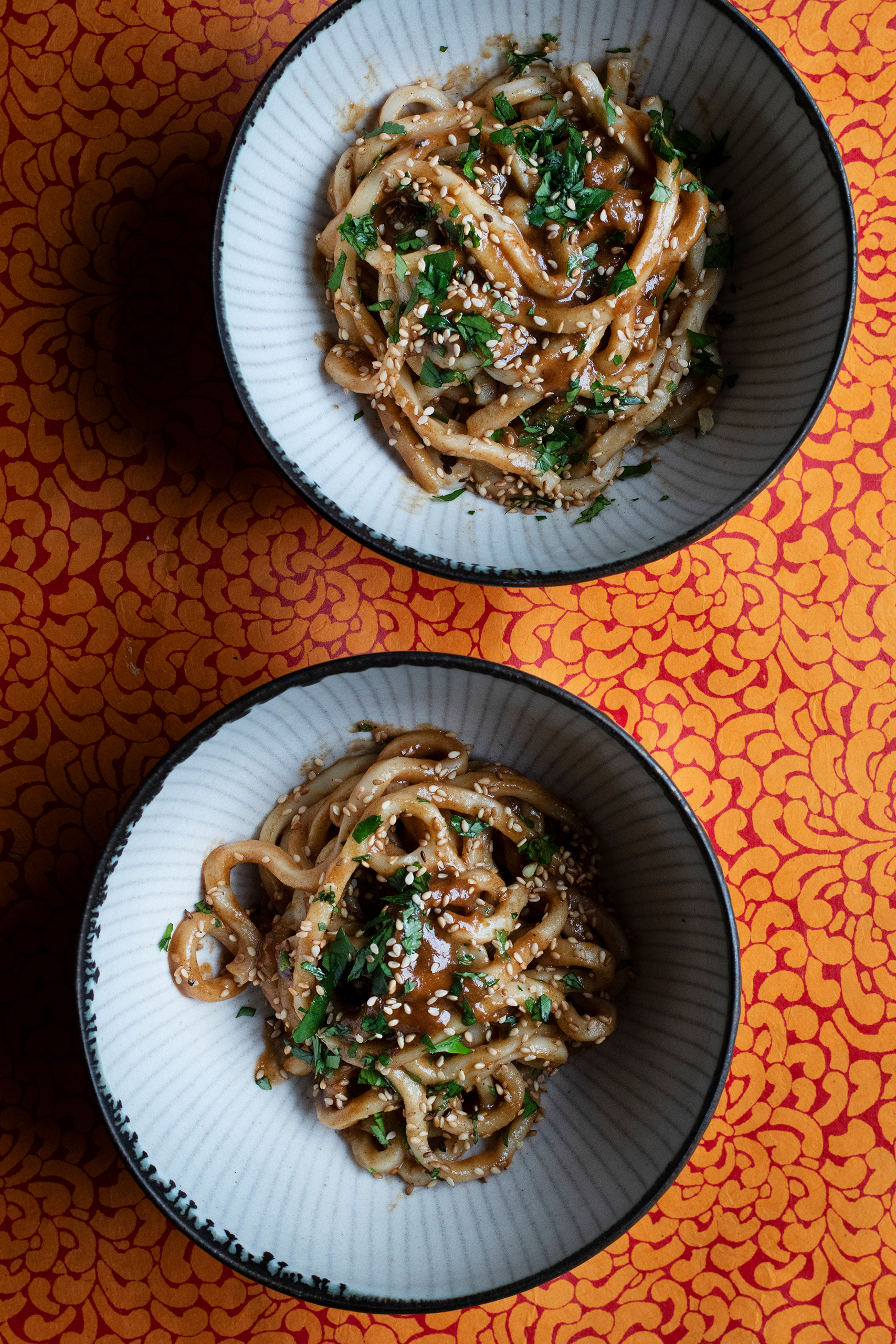This noodle supper is on the table in minutes, involves almost no cooking and also happens to be vegan. It is one of those recipes open to endless tweaking and you can use more or less sesame paste, mirin, soy or garlic as the fancy takes you. The sauce is improved immeasurably by using Chinese roasted sesame paste if you can get it. The seeds being roasted before grinding, it has a darker colour and deeper flavour than the usual paler varieties