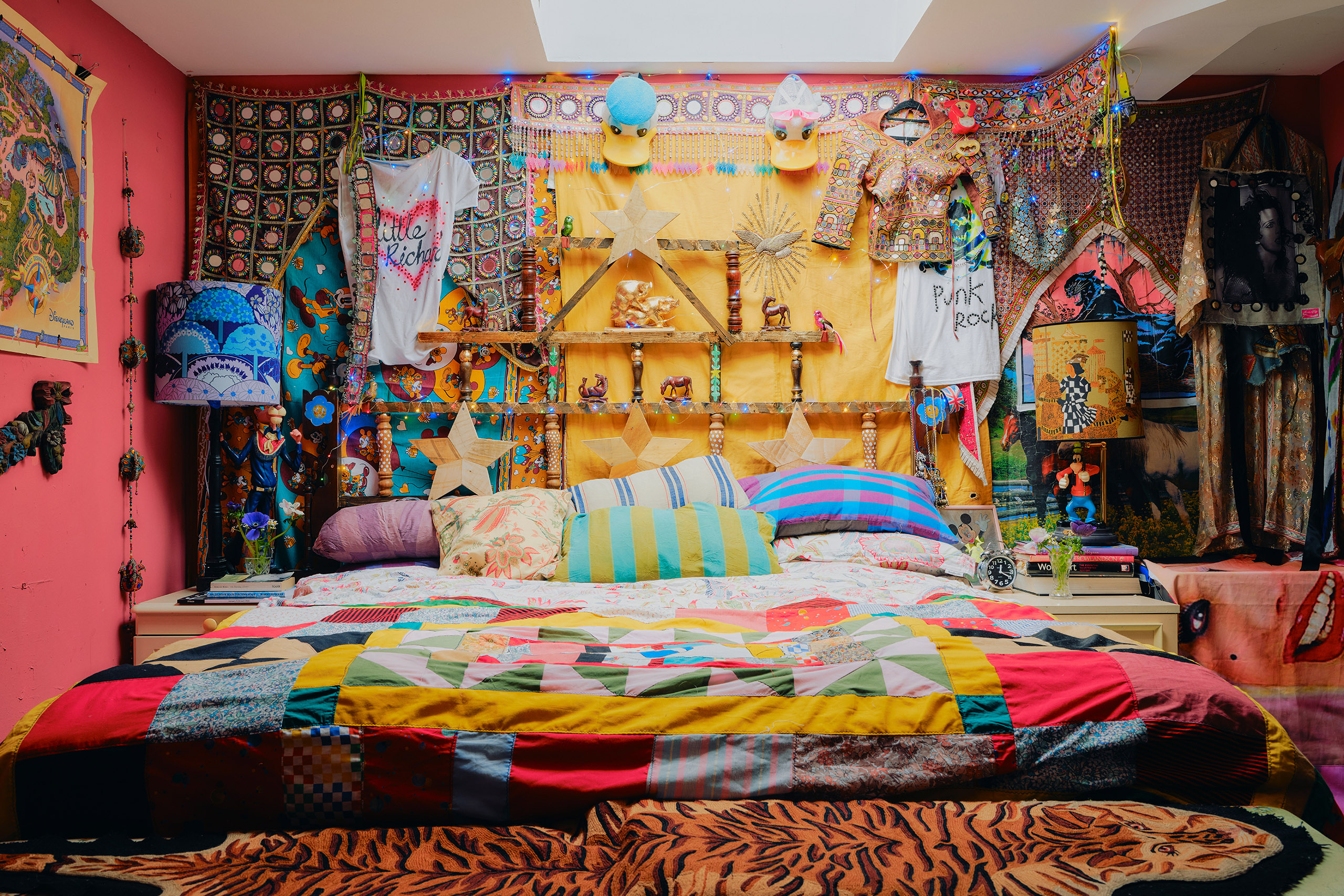 Allen prefers to paint, heat-print, or appliqué on to pre-existing materials so that the process remains legible. “You can bring an old sheet from a charity shop and some sequins through this studio, and it will turn into something interesting at the end of it.” This principle also applies to the interiors. “Lots of things were found in the street and painted,” Allen explains. The mirrors are pink, the doors decoupaged with faces both famous and forgotten.