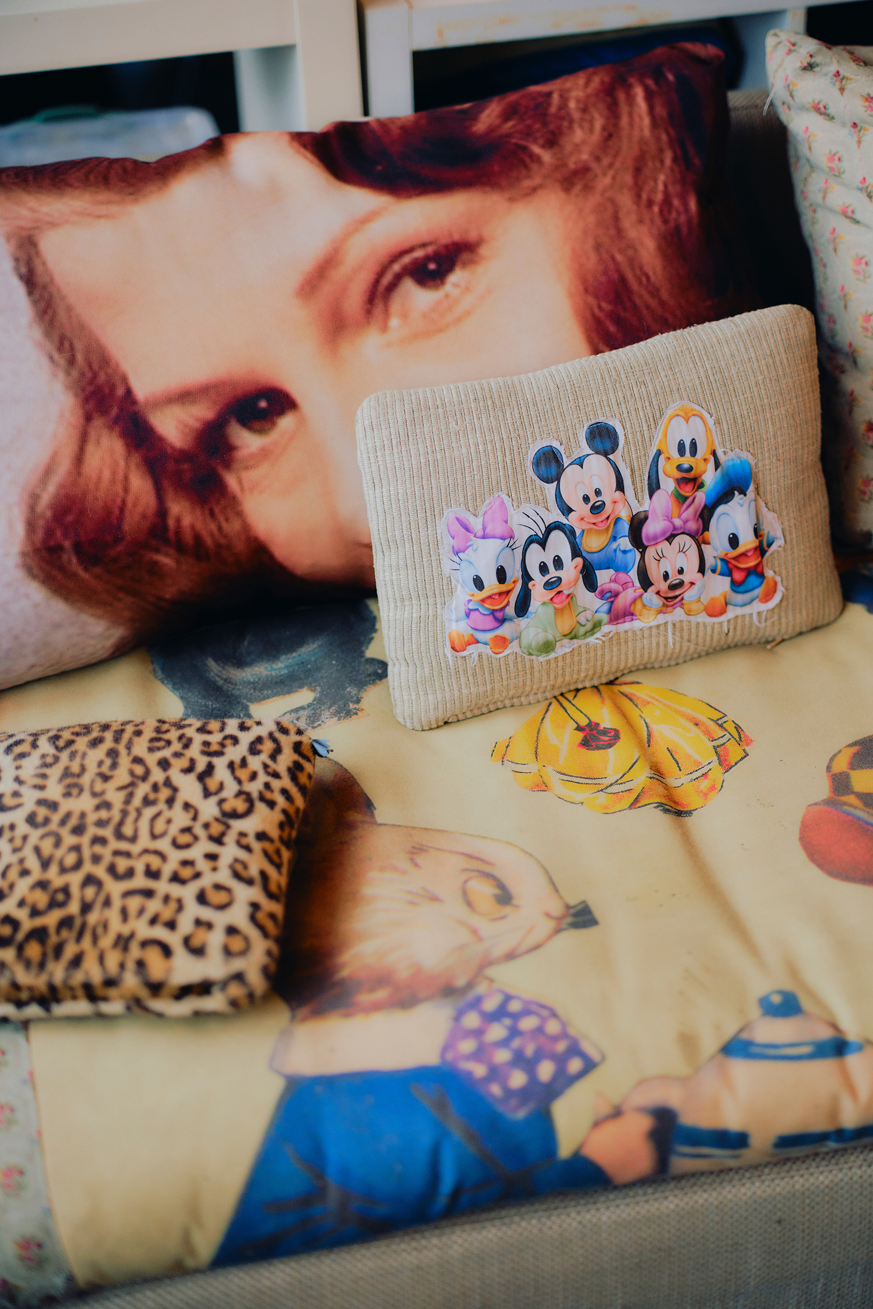 One garment carries the face of Italian opera star Moira Orfei; another assembles a chorus of blondes, Marilyn Monroe and Gwen Stefani smouldering from the fabric. Here, ideas are sketched, cut, collaged and debated. A poster glimpsed in the kitchen or a piece of tinsel overhead might prompt a sleeve, a hat, or even a fully fledged character by mid-afternoon.