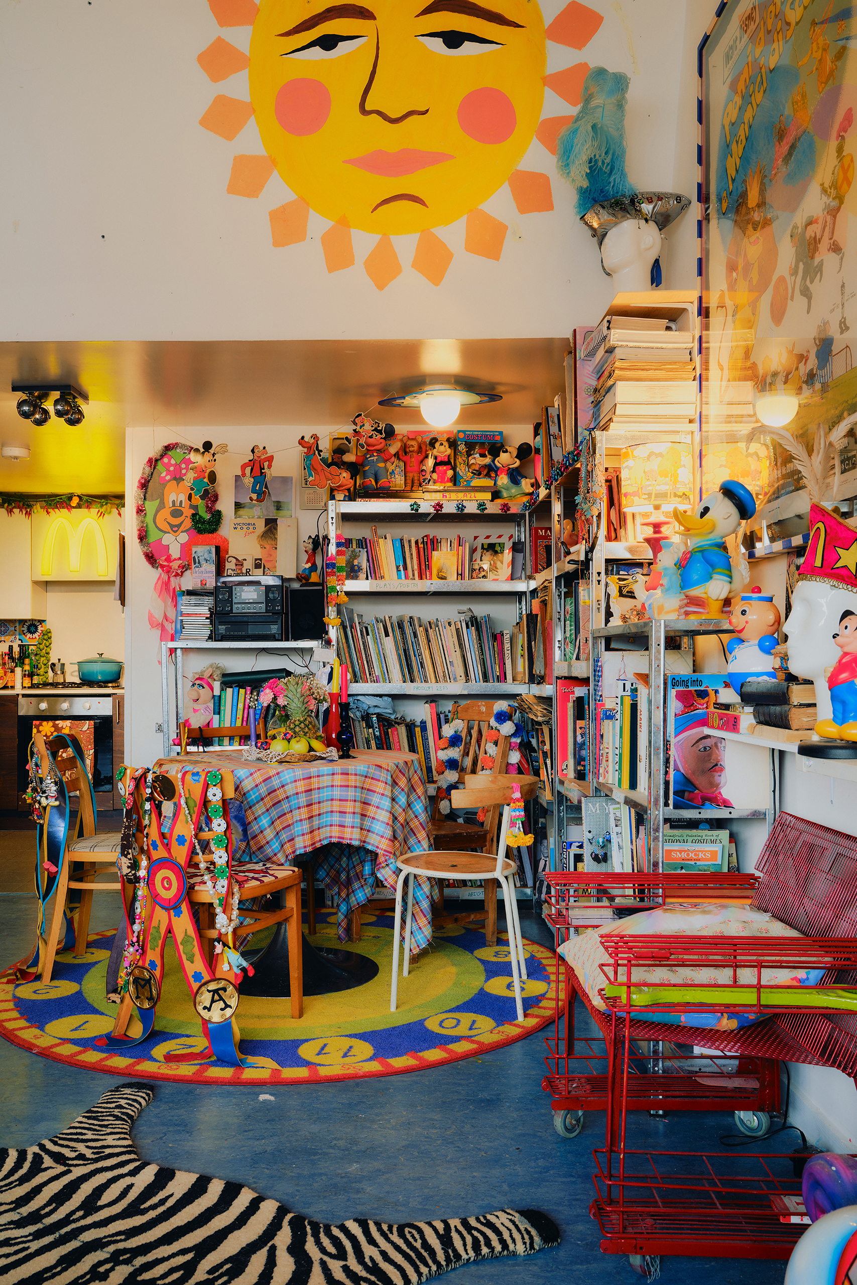 The flat is as exuberant as one might expect. Masks populate the walls; blown-glass witches’ balls hang in the windows like gargantuan Christmas baubles; cardboard German Easter eggs cluster in bowls; ranks of Disney figures hold their poses. Yet nothing is sealed off from use. The side table doubles as a print bench. Books are constantly being pulled down and rifled through, the apartment operating as a working library.